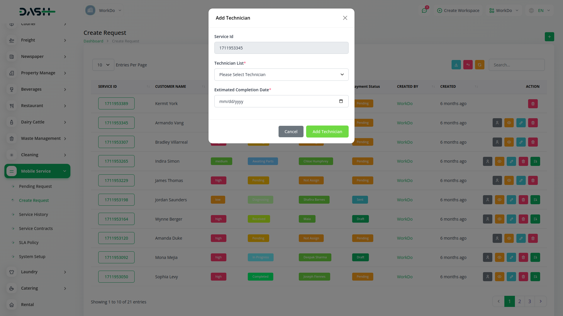 Dash SaaS presents the integration of Mobile Service Management, a solution designed to revolutionize customer service operations. This innovative integration empowers businesses to effortlessly manage customer requests, assign technicians, track mobile parts inventory, and generate bills—all from the convenience of a mobile device.
