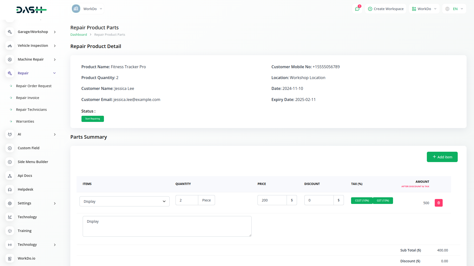In addition to managing repair orders, our module offers robust scheduling and progress-tracking features. Whether you are planning repairs for multiple clients or monitoring the status of ongoing tasks, Dash SaaS provides real-time updates and notifications to keep you informed every step of the way.